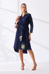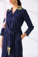 Navy Cotton Satin Belted Shirt Dress with 3D Embroidery