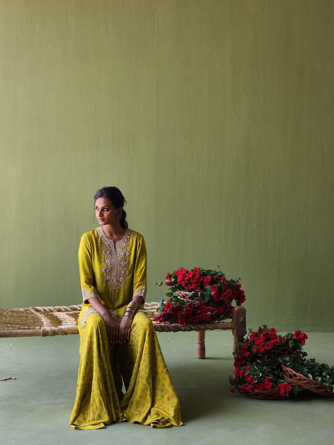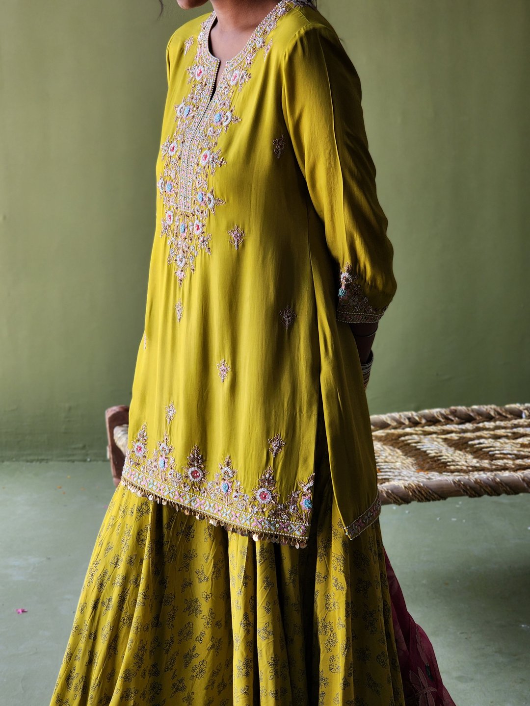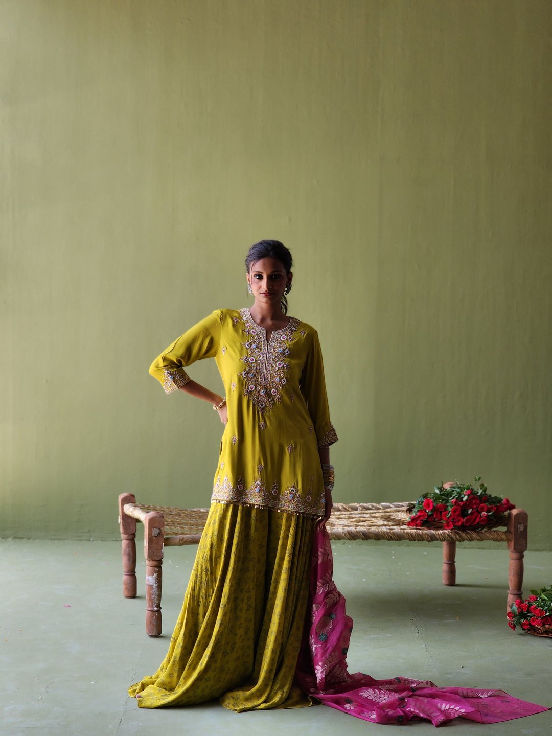 Mehendi Green Embroidered Short Kurta & Sharara Set