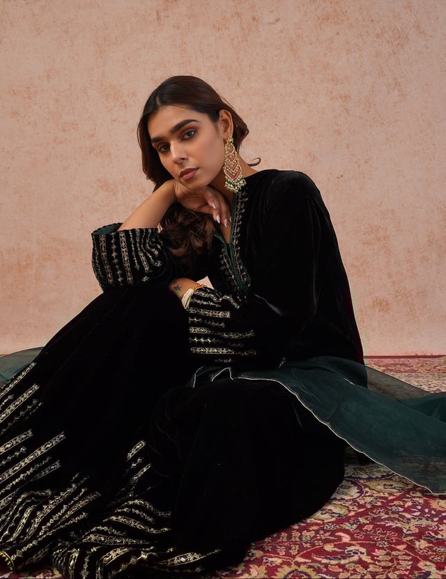 Black Velvet Embroidered Sharara Set