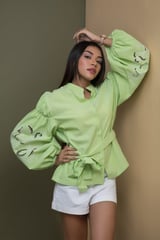 Lime Green Cotton Chambray Cutwork Balloon Sleeve Shirt