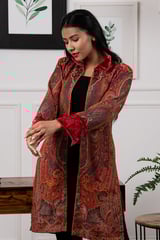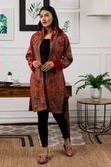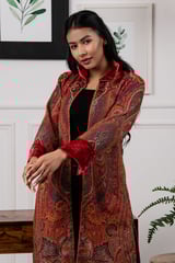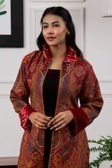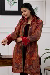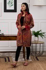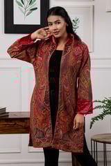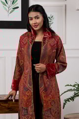 Burgundy Wool Jacquard Longline Coat with Velvet Trim