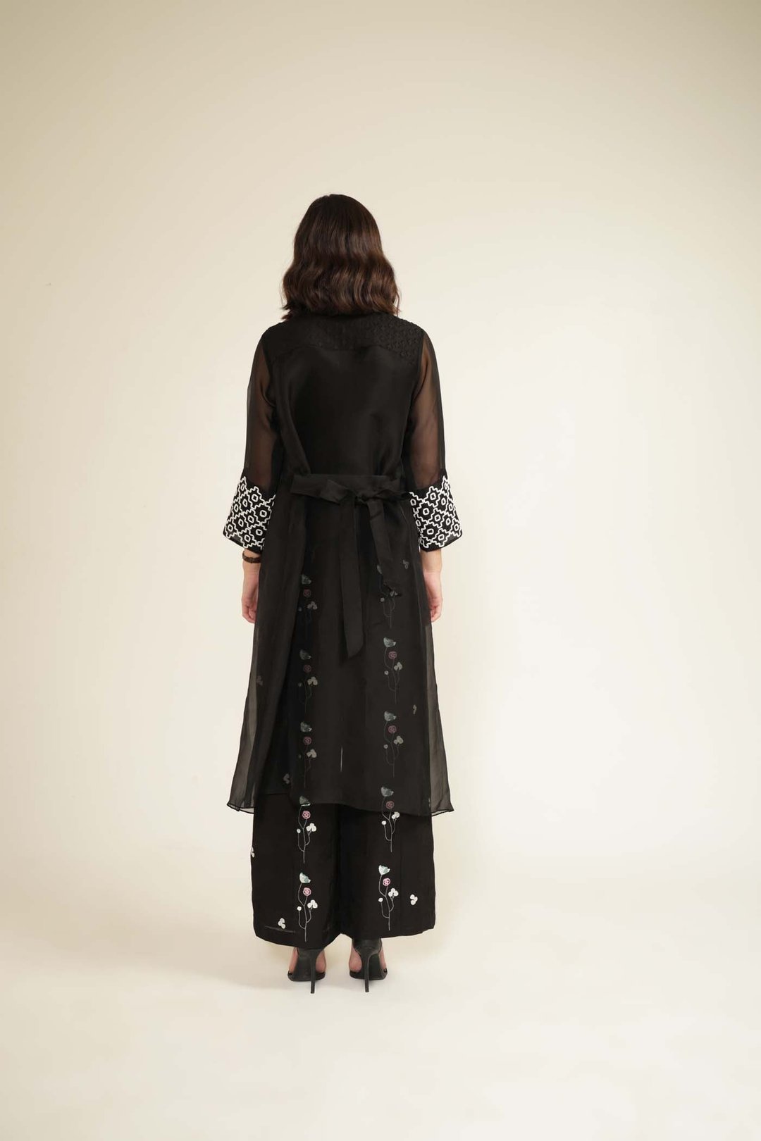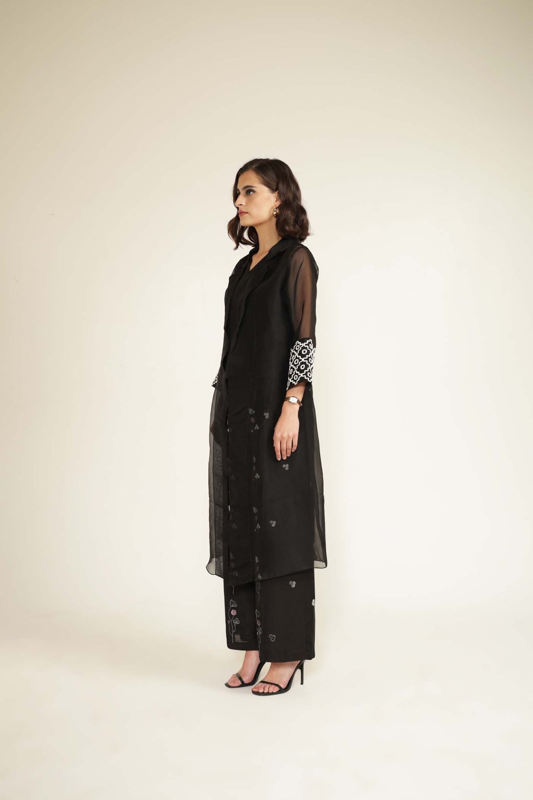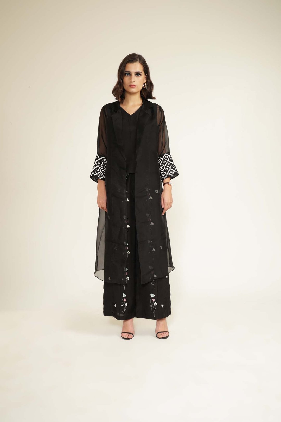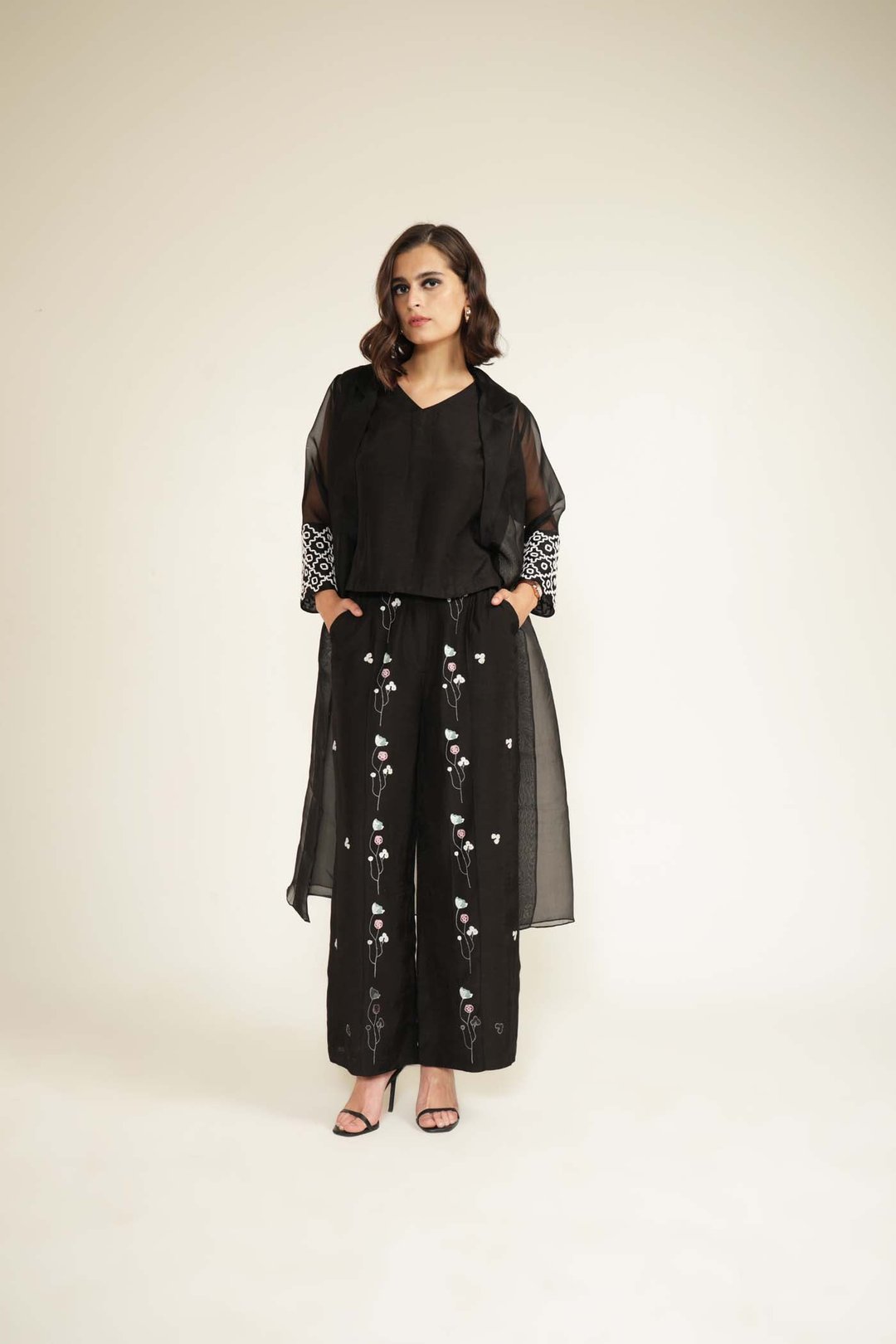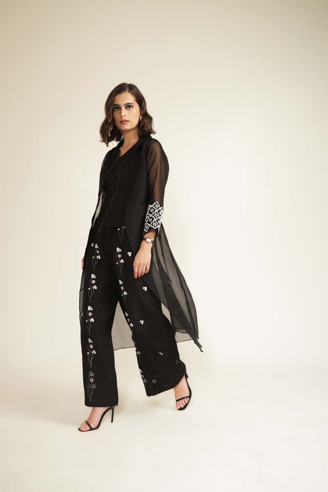 Black Organza Jacket with Embroided Sleeves and Printed Flared Pants in Linen