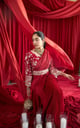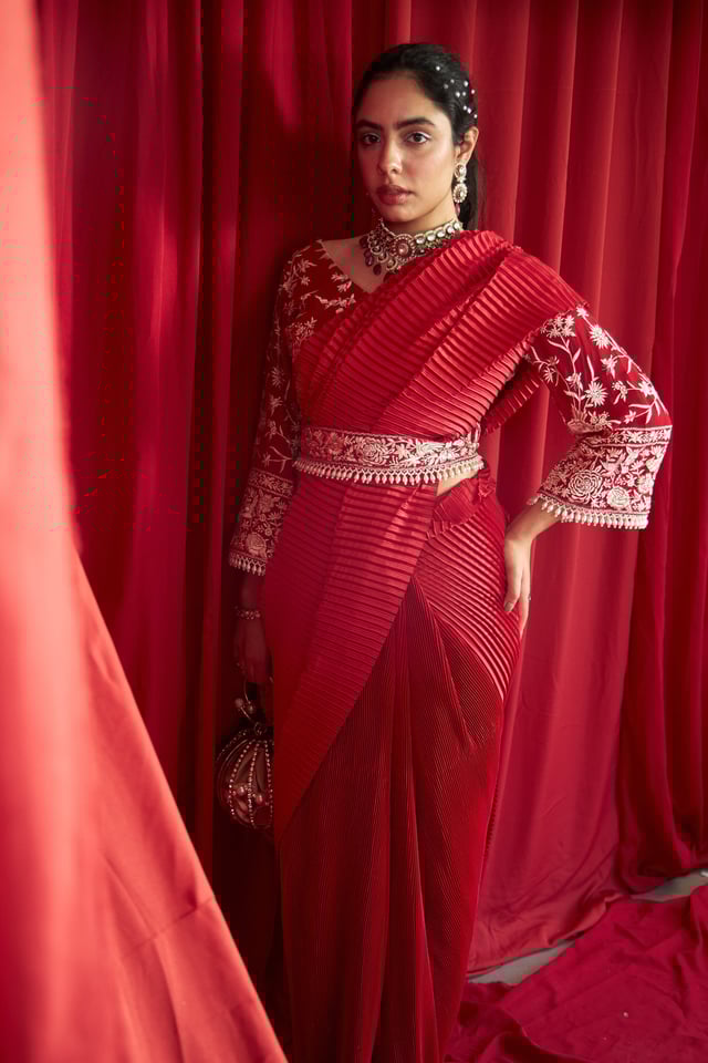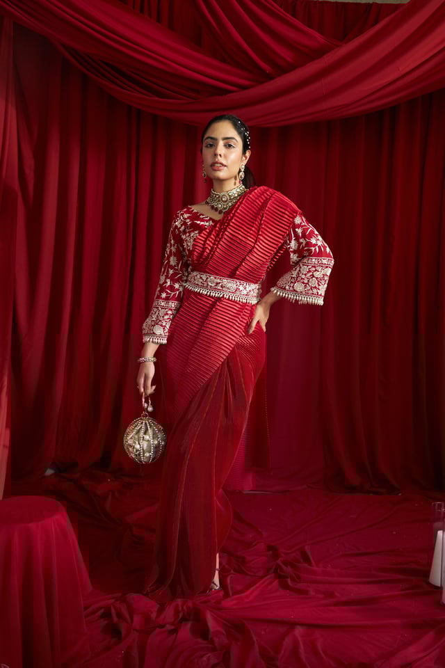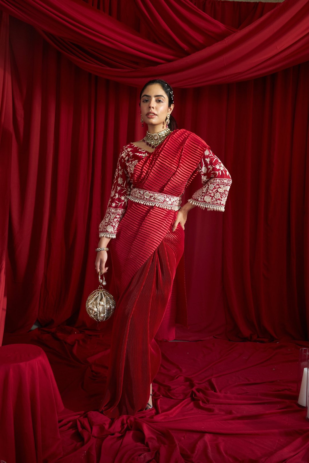 Pleated Skirt Saree with Bell Sleeve Blouse & Belt
