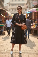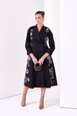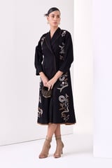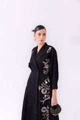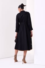 Black Cotton Satin Wrap-Trench Midi Dress with Embroidery