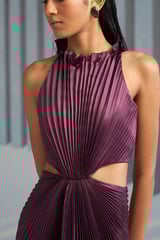 Purple Pleated Halter Maxi Gown with Waist Cut-Outs