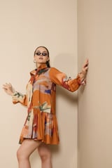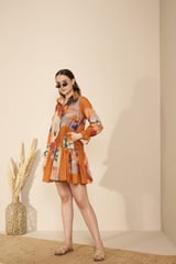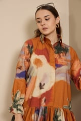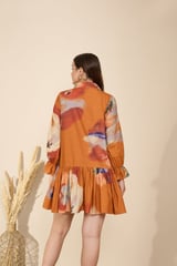 Rust Abstract Print Tiered Mini Shirt Dress