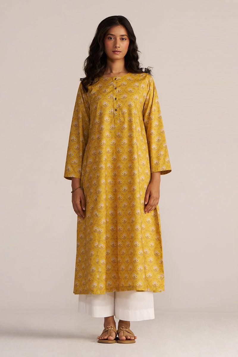 Mustard Yellow Print Cotton Kurta