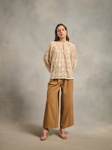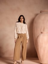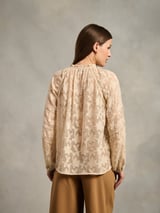 Beige Jacquard High Neck Keyhole Bishop Sleeve Blouse