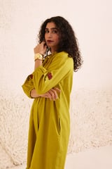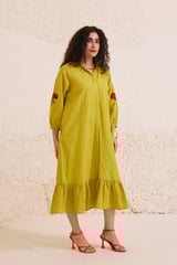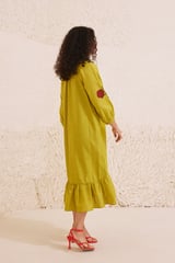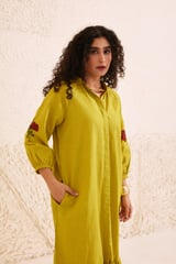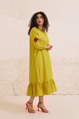 Lime Green Mandarin Collar Midi Dress with Floral Sleeves